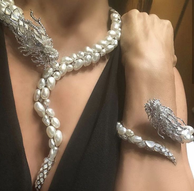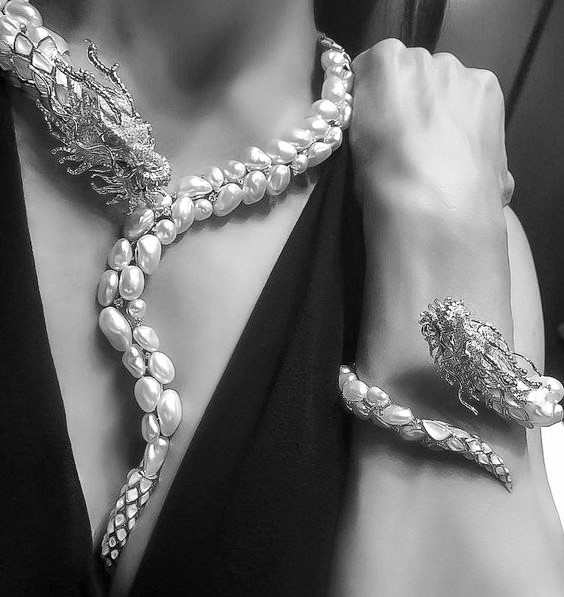 Autore Pearls markasının Pekin Yasak Şehir’deki 9 Ejderha Duvarı’ndan esinlenerek tasarladığı ‘Dragon’ kolye ve bileklik. Bu göz alıcı kolye ve bileklik 5.075 karat renksiz pırlanta, siyah pırlanta, ay taşı, sedef inci ve keshi güney denizi incileri ve beyaz altından oluşuyor.