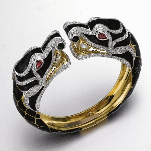 Bilekliğin uçları karşılıklı ejderha başlarıyla süslüdür; gözler armut biçimli yakutlarla, burunlar yuvarlak kabaşon zümrütlerle, her biri çenesinde kültür incisi tutmaktadır; siyah mine aplikeli ve yaklaşık 5,50 karat ağırlığında küçük yuvarlak elmaslarla süslüdür; 18 ayar altınla işlenmiştir.
