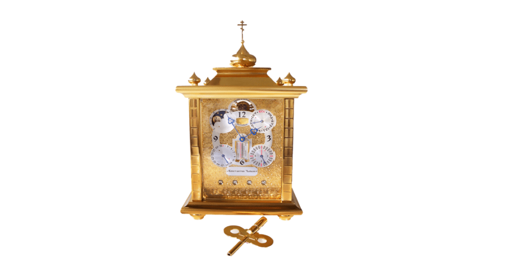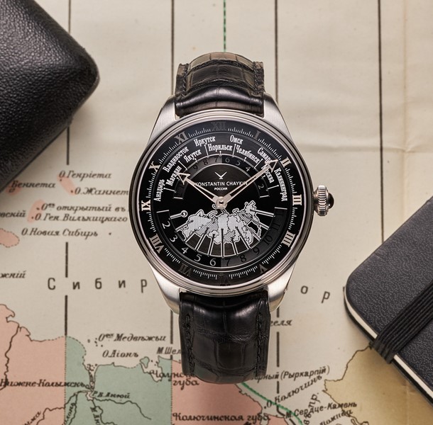 “Güney denizlerinden kutup topraklarına…”. Rusya’nın doğudan batıya uzanan inanılmaz uzunluğu, Chaykine bu çarpıcı özelliği saat mekanizmalarının çarklarında ve ibrelerinde temsil edebilecek saatler icat etmesi için ilham olmuştur.