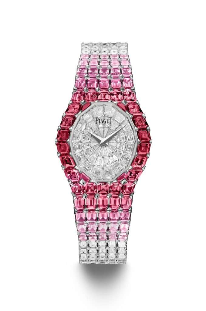 İlk olarak 1989 yılında piyasaya sürülen Aura, baget kesim pırlantalardan oluşan bileziği ve kusursuz bir şekilde entegre edilmiş kadranı ile hemen dikkatleri üzerine çekmişti. 35. yıldönümünü kutlamak için Piaget, yakut, pembe safir ve pırlantalardan oluşan iki eşsiz parçayı piyasaya sürdü. Parçalardan biri, koyu kırmızı yakutların en tatlı pembe safirlere ve elmaslara dönüşmesiyle Piaget’nin yüksek mücevherlerdeki inanılmaz taş dizilimini sergiliyor. Koleksiyon olarak Aura, Piaget’nin yüksek mücevher ve saat yapımcılığının zirvesinde olduğunun ve her zaman öyle kalacağının en üst düzey göstergesidir.