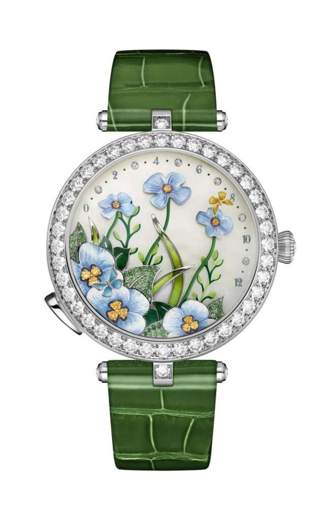 Van Cleef & Arpels, zamanın şiirselliğini resmetme konusunda kendilerini aşmaktan asla vazgeçmiyorlar. Öyle ki, tüm arşivleri başlı başına bir koleksiyon niteliği taşıyor. Ancak bu yıl maison, kuruluşundan bu yana kendilerine rehberlik eden temaya, yani doğaya saygı göstererek yeniden bir döngü başlatıyor. Maison, 38 mm beyaz altından oluşan bir tuval üzerinde çiçekleri açtırırken, zamanın geçişini göstermek için bir animasyon modülü aracılığıyla uçuşan narin kelebekleri kullanıyor. Emaye yapraklar ve tsavorit garnet, hem doğanın hem de zamanın sonsuz döngüsüne işaret ediyor.