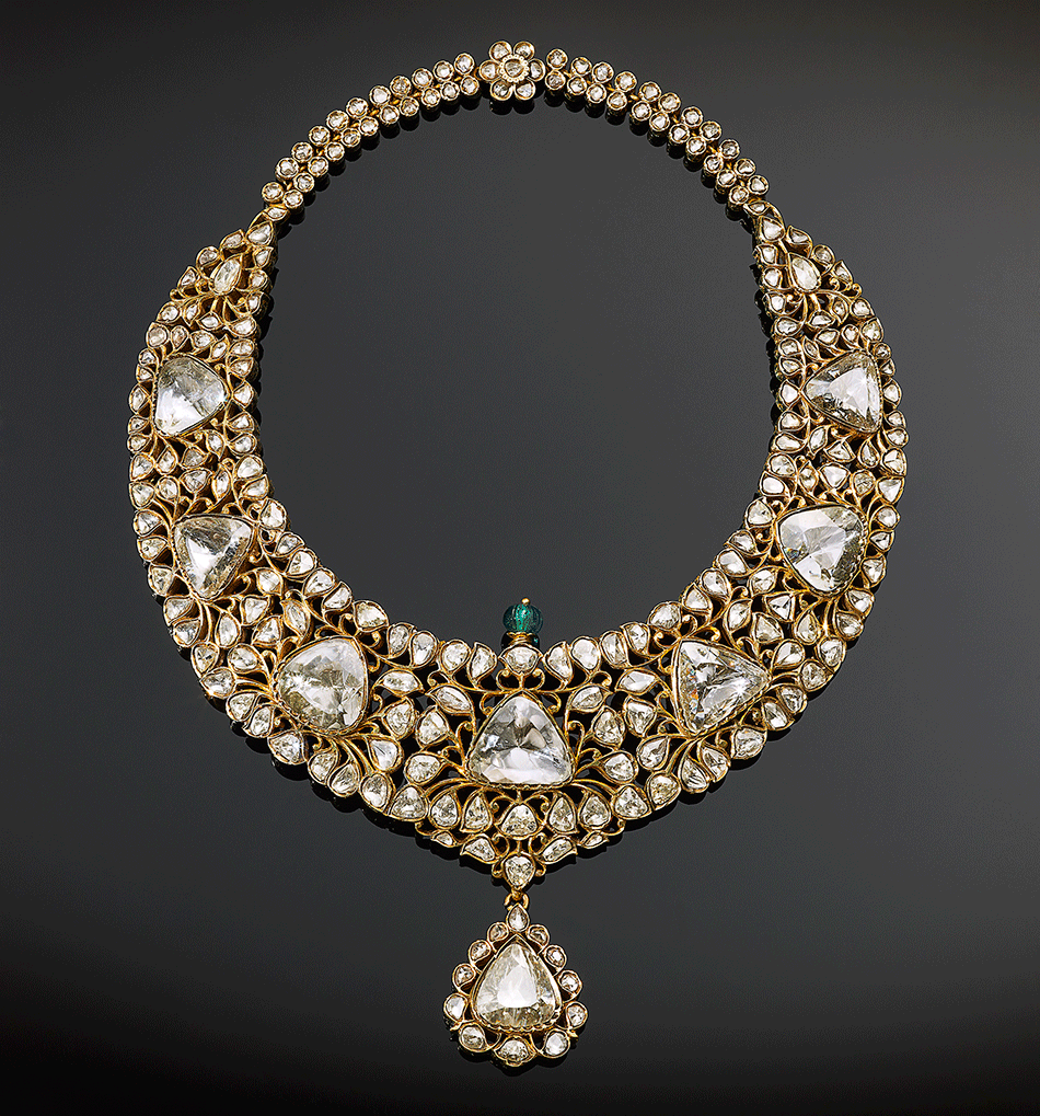 Haydarabad Nizamı Kolyesi (19. yüzyılın ortalarından sonlarına kadar) altından yapılmıştır ve her biri kundan setli elmas yapraklardan oluşan ajurlu bir panelle çerçevelenmiş yedi büyük varaklı üçgen elmasla süslenmiştir. Ön ortada, 12 elmas yaprakla çevrili üçgen bir elmas kolye ucu yer almakta olup, iç kenarına karpuz kesim bir zümrüt yerleştirilmiştir.