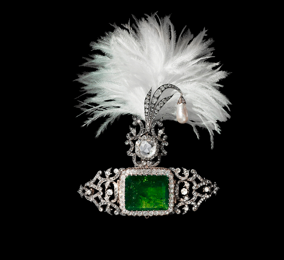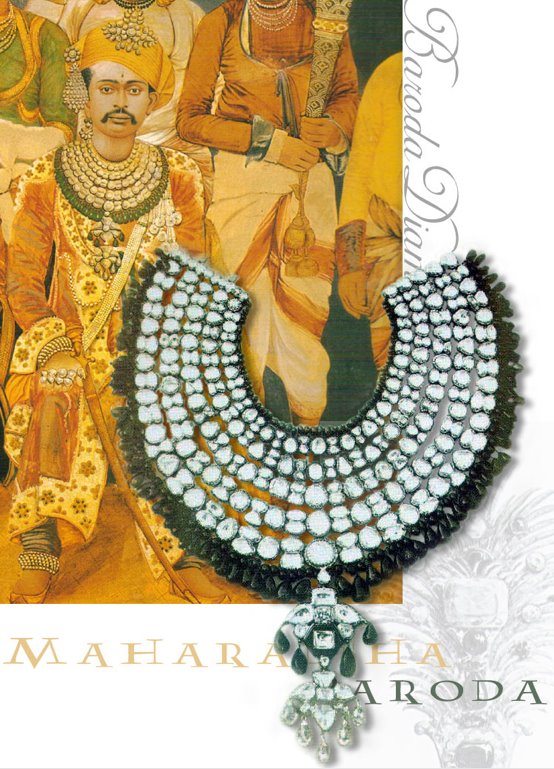 Bu muhteşem tören kolyesi, 1860’larda Hindistan’ın Baroda Maharaja’sı tarafından takılmış elmaslar ve zümrütlerle süslüydü. 1940’larda, Baroda’nın yeni Maharani’si (Kraliçesi) Sita Dev için bilezikler için taş sağlamak amacıyla parçalandığı söyleniyor.