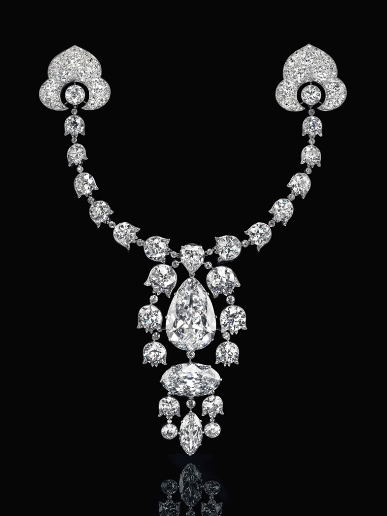 Tarihte bilinen en değerli renkli pırlanta dizisi, 27,0 karatlık bir çift nadir pembe carré kesim pırlanta ile çevrelenmiş iki sıra en kaliteli beyaz pırlantadan oluşuyor. 9,6 karatlık koyu pembe pırlanta ile başlayıp 26,26 karatlık masmavi mavi pırlanta ve 22,97 karatlık bir başka yoğun pembe pırlanta ile devam ediyor. Jaques Cartier bu taşı var olan en iyi pembe pırlanta, eşsiz ve tarif edilemez olarak nitelendirmiştir. Merkezdeki üç parça, ünlü 136 karatlık “ Queen of Holland ” ve 12,86 karatlık zeytin yeşili bir pırlanta ( eskiden Haydarabad Nizamı’na ait olan 17,5 karatlık oval bir taşdı) ve 15.62 karatlık açık pembe bir elmasdan oluşuyor. Kolye toplamda yaklaşık 500 karat ağırlığındaydı.