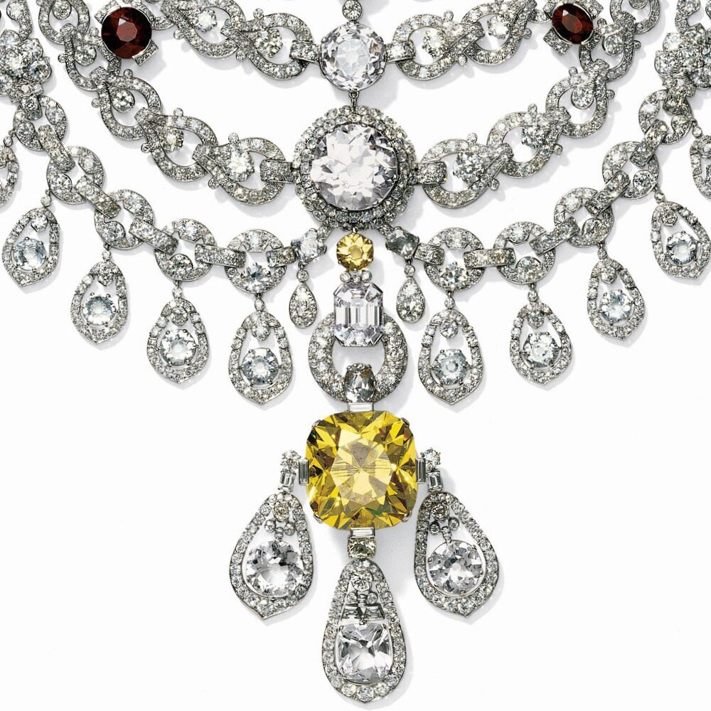 Görkemli geçit töreni kolyeleri 19. yüzyılın sonlarında Hint kraliyet kıyafetlerine damgasını vurmuştur ve bu Haydarabad Nizamı Kolyesi, Hint prenslik mücevherlerinin özellikle görkemli bir örneğidir.