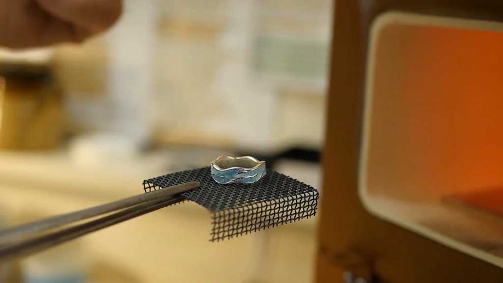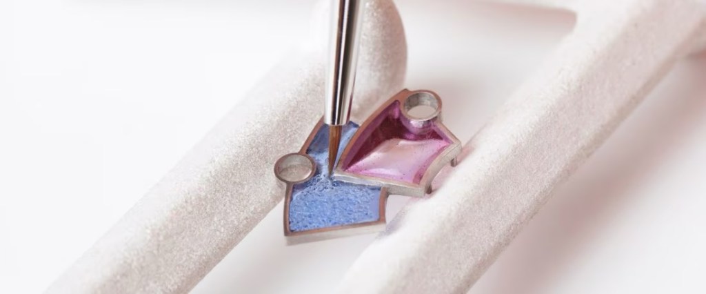Emayeleme – mine, ince öğütülmüş, toz haline getirilmiş camın yüksek ısı kullanılarak metal bir yüzeye eritildiği, sert ve parlak bir malzeme haline getirildiği bir işlemdir. Renkli emaye oluşturmak için fırınlamadan önce cam tozuna çok çeşitli oksitler eklenebilir. Farklı oksitler farklı renkler oluşturur – beyaz için kalay, siyah için demir, mavi veya turkuaz için kobalt ve bakır, sarı için uranyum ve demir kullanılır. Kırmızı ve pembe, bakır ve altın içerikleri nedeniyle özellikle değerli renklerdir. Bu toz karışımlar saf su ile birleştirilerek bir macun haline getirilir ve daha sonra pişirilmeden önce metal bir forma, genellikle bakır, gümüş veya altına uygulanır. Daha yüksek sıcaklıklar daha net ve yarı saydam emaye ile sonuçlanırken, düşük sıcaklıklar da koyu, opak tonlar oluşturur. Genel olarak, daha yüksek sıcaklıklar daha güçlü emaye ve daha iyi canlılık sağlar. Aynı zamanda emaye ustası, emayeleri metallerle eşleştirirken erime noktasına dikkat etmelidir. Emayenin metale düzgün bir şekilde yapışmasını sağlamak için parça yüksek sıcaklıklarda pişirilmelidir. Çok düşük bir sıcaklık, düşük kaliteli emaye işiyle sonuçlanacaktır. Çok sıcak olduğunda ise tüm parça eriyecektir.