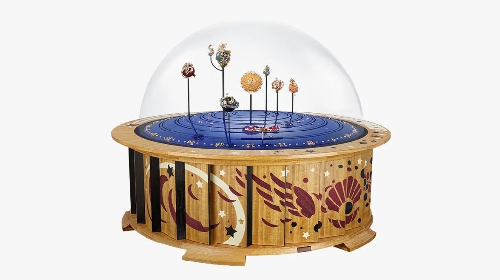 Van Cleef & Arpels, zarafet ve mekanik ustalığını buluşturan masa saati ve mücevher saat eserleriyle bu yıl da göz kamaştırıyor. Planétarium masa saati, el yapımı cam kubbesi altında gezegenlerin gerçek yörünge sürelerinde döndüğü etkileyici bir mühendislik harikası; her gezegen değerli taşlarla temsil edilirken, göksel haritalardan ilham alan altın şeritlerle süslenmiş.
