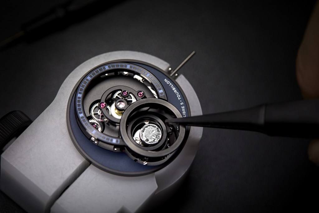 Octo Finissimo Ultra Tourbillon, yalnızca 1.85mm kalınlığında bir şaheser. Titanyum kasa ve tungsten karbür taban/arka kapak tek parça hâlinde tasarlanmış. Klasik tepe yerine yandaki düğmelerle kontrol ediliyor. Yeni BVF 900 mekanizması, aşırı ince yapı için tamamen yatay düzende tasarlanmış ve tourbillon kafesi yalnızca 1.18mm. Mekanizma, rulmanlarla çalıştığı için sadece 15 taş içeriyor. 42 saat güç rezervi sunuyor. Bu ultra ince yapıyı mümkün kılmak için birçok parça sıfırdan yeniden düşünüldü.