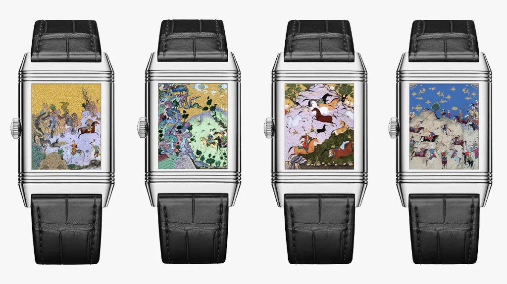 Reverso Tribute Enamel ‘Shahnameh’, Métiers Rares atölyesi tarafından grand feu mine ve paillonnage ile işlenmiş, Pers minyatürlerinden ve Şah Tahmasp’ın 16. yüzyıl el yazmasından esinlenen dört minyatür şaheser içeriyor. Jaeger-LeCoultre’un Reverso Hybris Artistica Calibre 179 modeli, sınırlı sayıda üretilen beyaz altın kasaya ve çok eksenli tourbillon mekanizmaya sahip bir saat olarak öne çıkıyor. Ters çevrilebilir kadranı ve yerçekimi dengeleme mekanizmasıyla dikkat çeken bu saat, yüksek işçilik kalitesiyle öne çıkıyor.