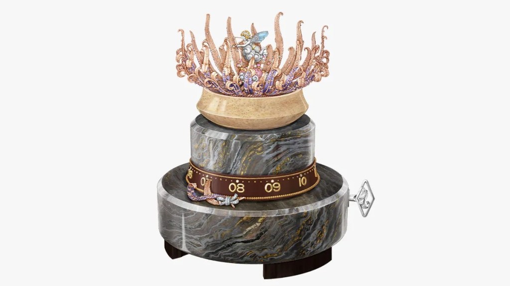 Naissance de l’Amour ise otomaton ustası François Junod iş birliğiyle tasarlanan daha küçük ama büyüleyici bir parça; değerli taşlarla bezenmiş bulutlar arasından yükselen kanatlı bir Cupid figürü, müzik eşliğinde dönerek ortaya çıkıyor.