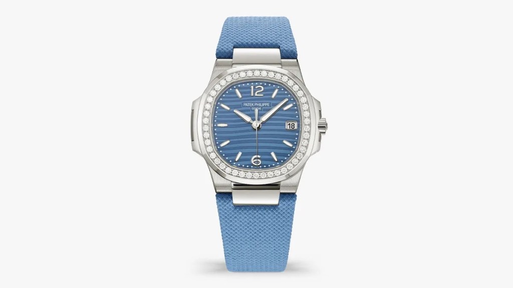 Kadınlara yönelik yeni Nautilus Date modeli ise beyaz altın kasası, 46 pırlantalı bezeli ve dalga desenli açık mavi lake kadranıyla dikkat çekiyor. Ref. 7010G-013, mavi kayışla veya beyaz altın bilezikle sunuluyor.